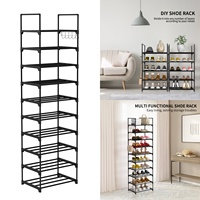 10-Tier Shoe Rack, Metal Shoe Storage Organiser with Hook, DIY Design, Metal Frame, Space-Saving Rack, 30 x 43 x 174 cm, Black
