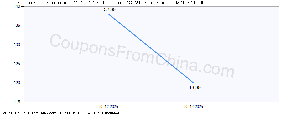 Price history (for all/most countries) for 12MP 20X Optical Zoom 4G/WiFi Solar Camera is here. The lowest price was: $119.99.