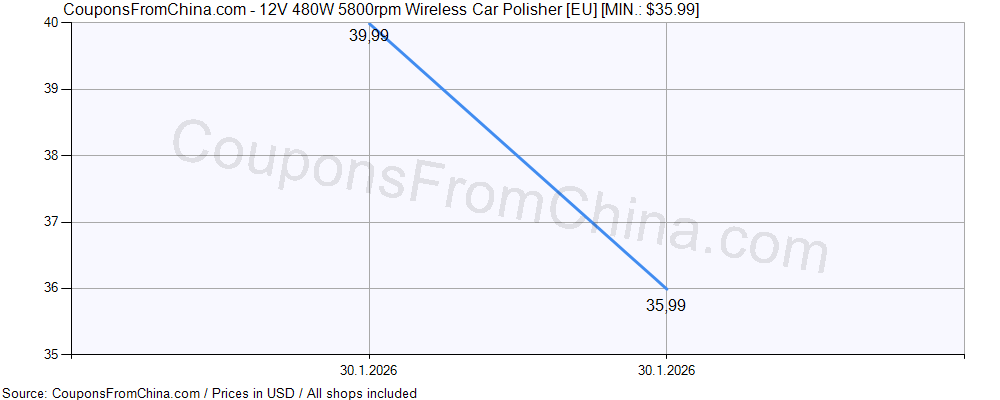 Here is price history (for all/most countries) for 12V 480W 5800rpm Wireless Car Polisher [EU]. The lowest price was: $35.99.