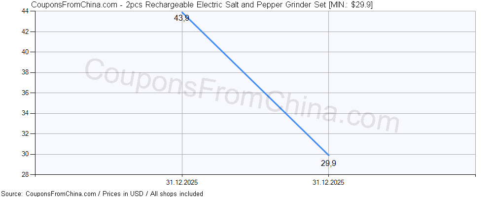 Check out price history chart (for all/most countries) for 2pcs Rechargeable Electric Salt and Pepper Grinder Set. The lowest price was: $29.9.