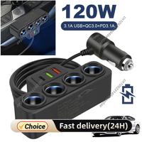 12V-24V Car Cigarette Lighter Adapter QC3.0+PD 3.1A 3 USB Ports 4-Socket 120W Phone Power Adapter Fast Charger Plug $12.32