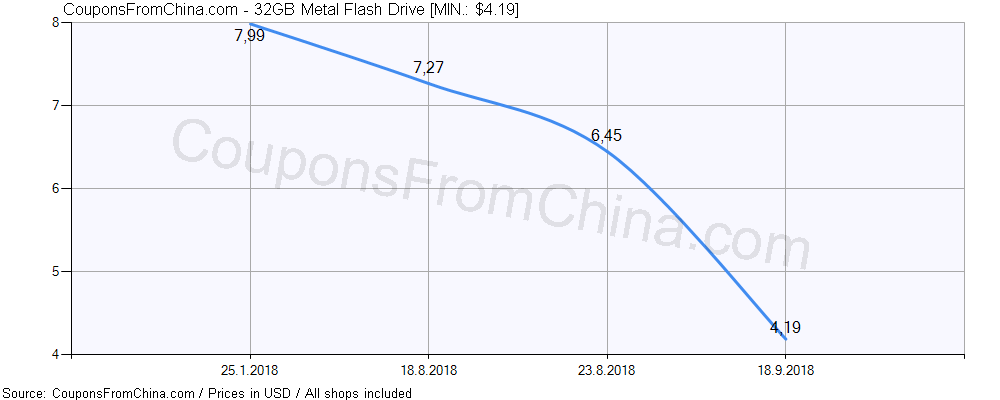 Do you need price history chart (for all/most countries) for 32GB Metal Flash Drive? There we go. The lowest price was: $4.19.