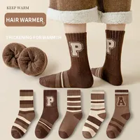 5 Pairs Winter Autumn Thickened Warm Kids Boys Half Socks Letter P & Striped Brushed Soft Cute Cozy Sports Socks for Child Boys $6.31