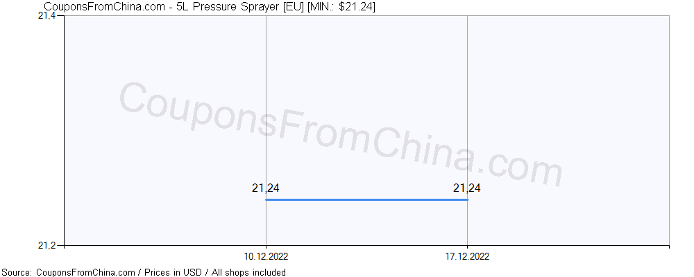 Check out price history chart (for all/most countries) for 5L Pressure Sprayer [EU]. The lowest price was: $21.24.