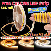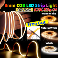 5M/roll Free Cut COB LED Strip Light 528LEDs/M 8MM PCB Width Warm/Natural White/Cool White Linear Lighting 12/24V Flexible Tape