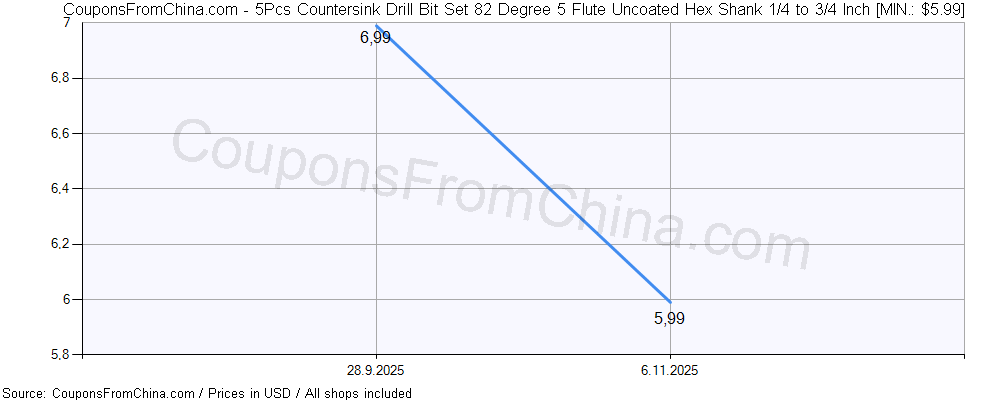 Do you need price history chart (for all/most countries) for 5Pcs Countersink Drill Bit Set 82 Degree 5 Flute Uncoated Hex Shank 1/4 to 3/4 Inch? There we go. The lowest price was: $5.99.
