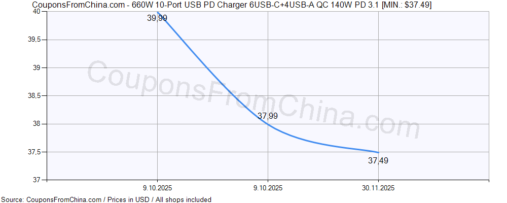 Price history (for all/most countries) for 660W 10-Port USB PD Charger 6USB-C+4USB-A QC 140W PD 3.1 is here. The lowest price was: $37.49.