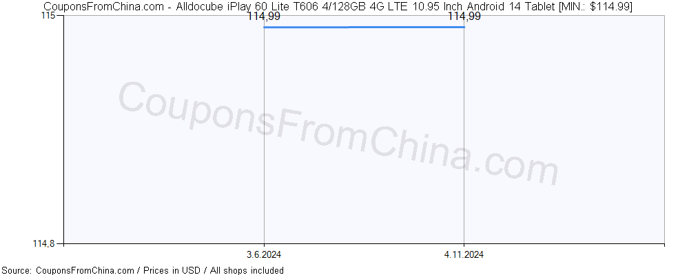 Here is price history (for all/most countries) for Alldocube iPlay 60 Lite T606 4/128GB 4G LTE 10.95 Inch Android 14 Tablet. The lowest price was: $114.99.