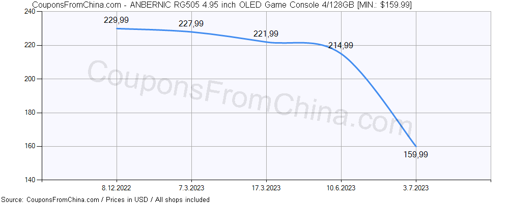 Do you need price history chart (for all/most countries) for ANBERNIC RG505 4.95 inch OLED Game Console 4/128GB? There we go. The lowest price was: $159.99.