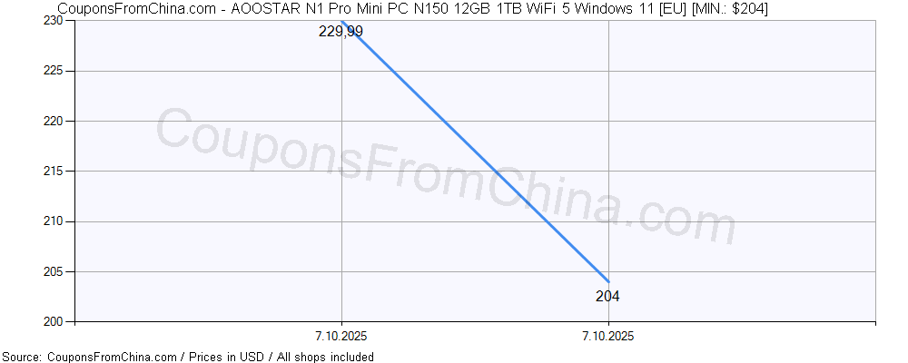 Check out price history chart (for all/most countries) for AOOSTAR N1 Pro Mini PC N150 12GB 1TB WiFi 5 Windows 11 [EU]. The lowest price was: $204.