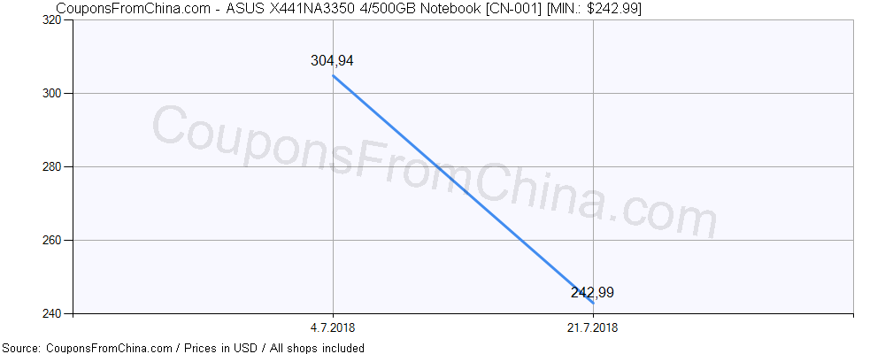 Check out price history chart (for all/most countries) for ASUS X441NA3350 4/500GB Notebook [CN-001]. The lowest price was: $242.99.