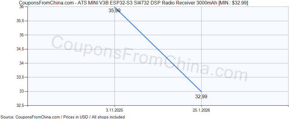 Price history (for all/most countries) for ATS MINI V3B ESP32-S3 SI4732 DSP Radio Receiver 3000mAh is here. The lowest price was: $32.99.