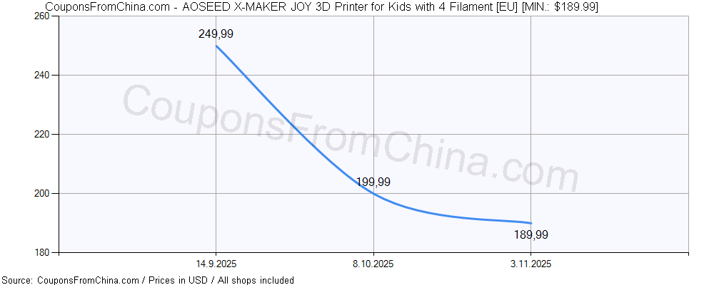![AOSEED X-MAKER JOY 3D Printer for Kids with 4 Filament [EU] price history Price history for AOSEED X-MAKER JOY 3D Printer for Kids with 4 Filament [EU]](https://couponsfromchina.com/pricehistory/History54052.png)