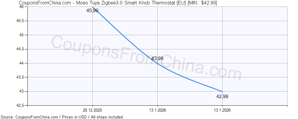 Do you need price history chart (for all/most countries) for Moes Tuya Zigbee3.0 Smart Knob Thermostat [EU]? There we go. The lowest price was: $42.99.
