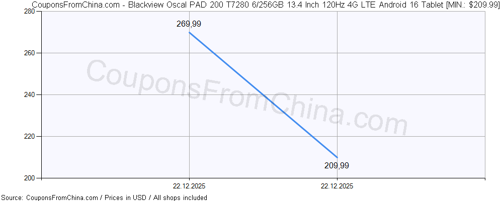 Check out price history chart (for all/most countries) for Blackview Oscal PAD 200 T7280 6/256GB 13.4 Inch 120Hz 4G LTE Android 16 Tablet. The lowest price was: $209.99.