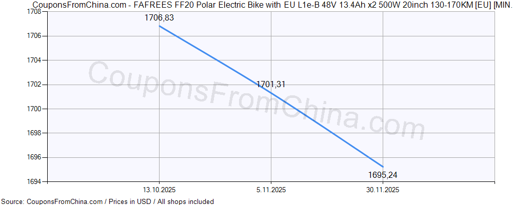 ![FAFREES FF20 Polar Electric Bike with EU L1e-B 48V 13.4Ah x2 500W 20inch 130-170KM [EU] price history Price history for FAFREES FF20 Polar Electric Bike with EU L1e-B 48V 13.4Ah x2 500W 20inch 130-170KM [EU]](https://couponsfromchina.com/pricehistory/History54471.png)