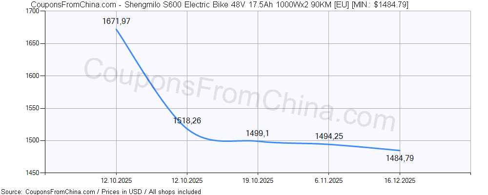 ![Shengmilo S600 Electric Bike 48V 17.5Ah 1000Wx2 90KM [EU] price history Price history for Shengmilo S600 Electric Bike 48V 17.5Ah 1000Wx2 90KM [EU]](https://couponsfromchina.com/pricehistory/History54444.png)
