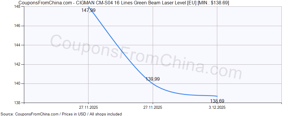 ![CIGMAN CM-S04 16 Lines Green Beam Laser Level [EU] price history Price history for CIGMAN CM-S04 16 Lines Green Beam Laser Level [EU]](https://couponsfromchina.com/pricehistory/History54968.png)