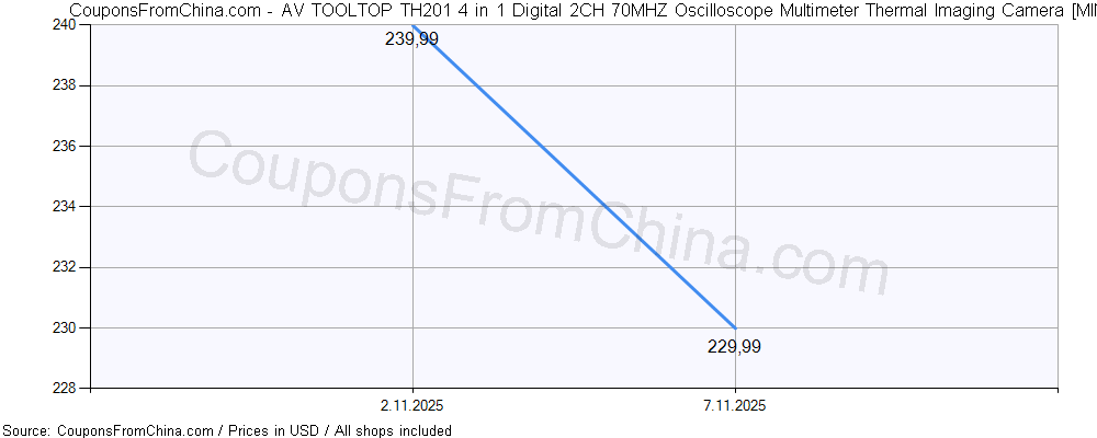 Here is price history (for all/most countries) for AV TOOLTOP TH201 4 in 1 Digital 2CH 70MHZ Oscilloscope Multimeter Thermal Imaging Camera. The lowest price was: $229.99.
