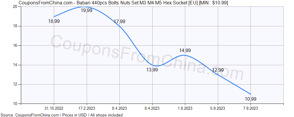 Click on image to enlarge. ![Baban 440pcs Bolts Nuts Set M3 M4 M5 Hex Socket [EU] price history Price history for Baban 440pcs Bolts Nuts Set M3 M4 M5 Hex Socket [EU]](https://couponsfromchina.com/pricehistory/History38118.png)