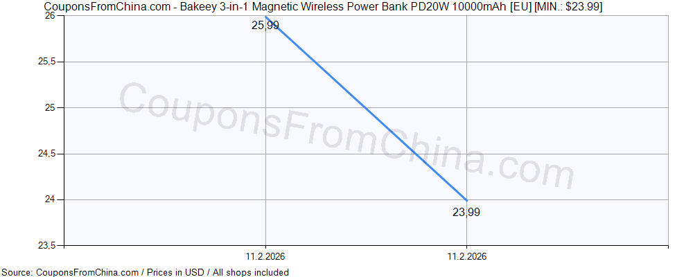 Check out price history chart (for all/most countries) for Bakeey 3-in-1 Magnetic Wireless Power Bank PD20W 10000mAh [EU]. The lowest price was: $23.99.