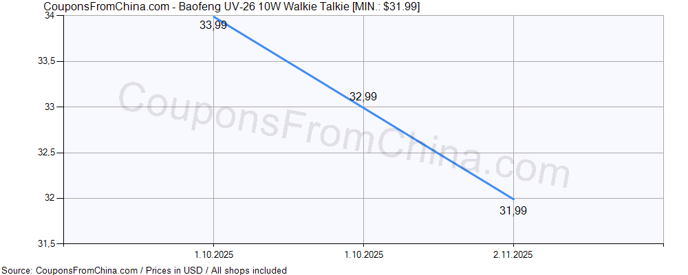 Do you need price history chart (for all/most countries) for Baofeng UV-26 10W Walkie Talkie? There we go. The lowest price was: $31.99.