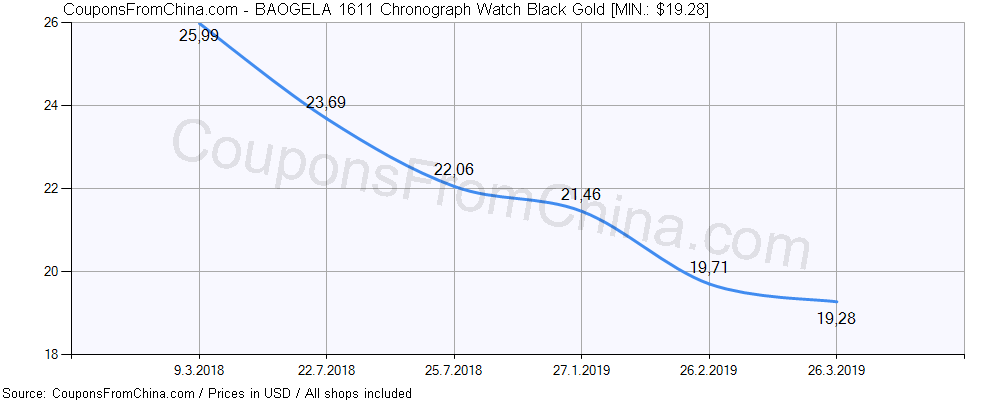 Price history (for all/most countries) for BAOGELA 1611 Chronograph Watch Black Gold is here. The lowest price was: $19.28.