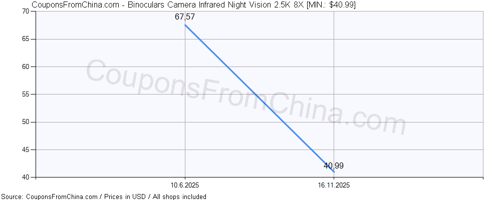 Here is price history (for all/most countries) for Binoculars Camera Infrared Night Vision 2.5K 8X. The lowest price was: $40.99.