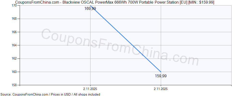 Check out price history chart (for all/most countries) for Blackview OSCAL PowerMax 666Wh 700W Portable Power Station [EU]. The lowest price was: $159.99.