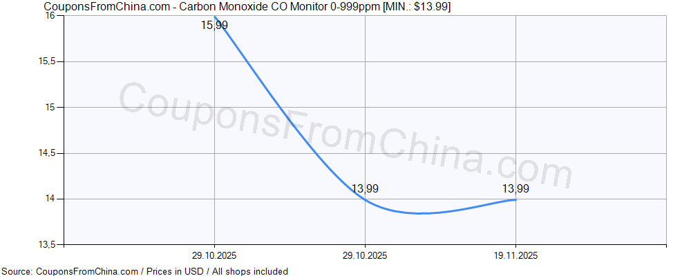 Do you need price history chart (for all/most countries) for Carbon Monoxide CO Monitor 0-999ppm? There we go. The lowest price was: $13.99.