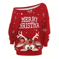 Plus Size 1Xl-5XL Women’s Fashion Christmas Print Long Sleeved Sweatshirt Ladies Casual Off Shoulder Print Pullover Top