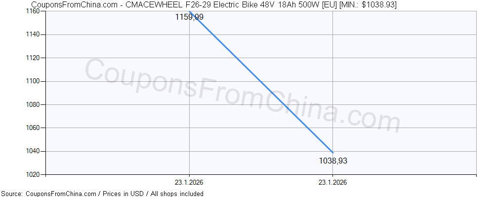 ![CMACEWHEEL F26-29 Electric Bike 48V 18Ah 500W [EU] price history Price history for CMACEWHEEL F26-29 Electric Bike 48V 18Ah 500W [EU]](https://couponsfromchina.com/pricehistory/History55290.png)