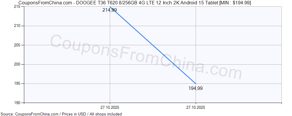 Price history (for all/most countries) for DOOGEE T36 T620 8/256GB 4G LTE 12 Inch 2K Android 15 Tablet is here. The lowest price was: $194.99.