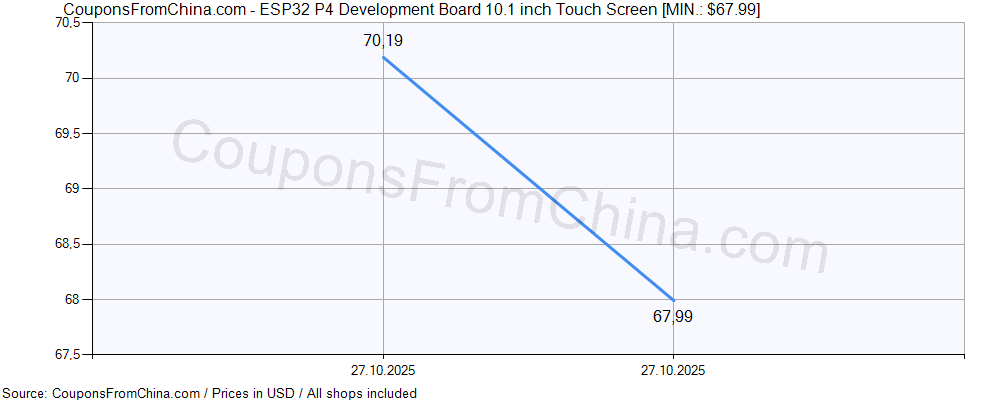 Here is price history (for all/most countries) for ESP32 P4 Development Board 10.1 inch Touch Screen. The lowest price was: $67.99.