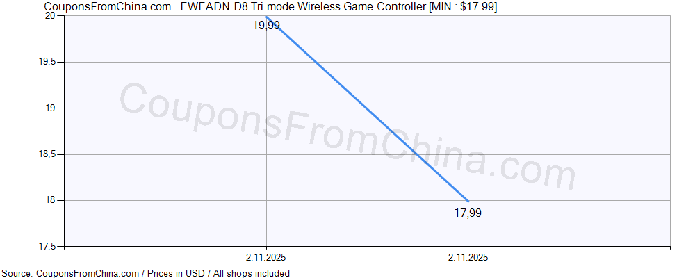 Here is price history (for all/most countries) for EWEADN D8 Tri-mode Wireless Game Controller. The lowest price was: $17.99.