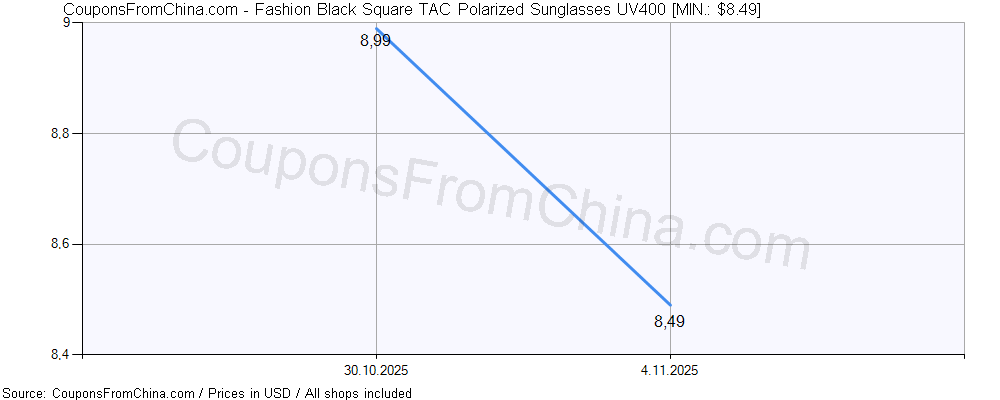 Check out price history chart (for all/most countries) for Fashion Black Square TAC Polarized Sunglasses UV400. The lowest price was: $8.49.