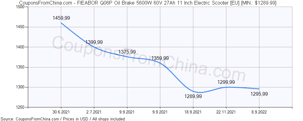 Do you need price history chart (for all/most countries) for FIEABOR Q06P Oil Brake 5600W 60V 27Ah 11 Inch Electric Scooter [EU]? There we go. The lowest price was: $1289.99.