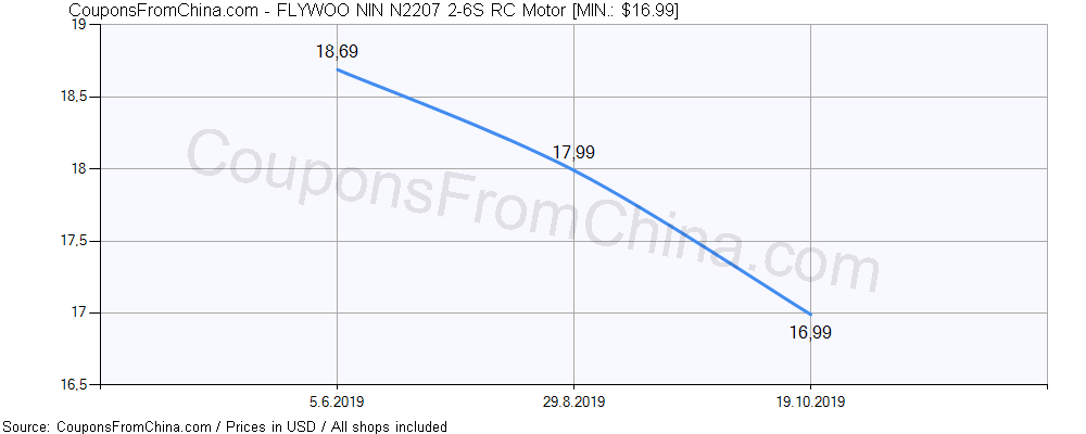 Here is price history (for all/most countries) for FLYWOO NIN N2207 2-6S RC Motor. The lowest price was: $16.99.