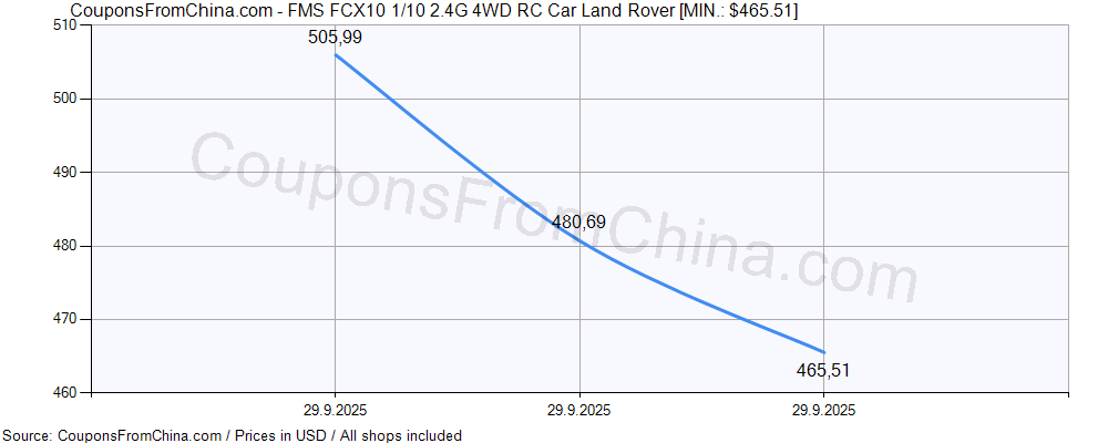 Do you need price history chart (for all/most countries) for FMS FCX10 1/10 2.4G 4WD RC Car Land Rover? There we go. The lowest price was: $465.51.