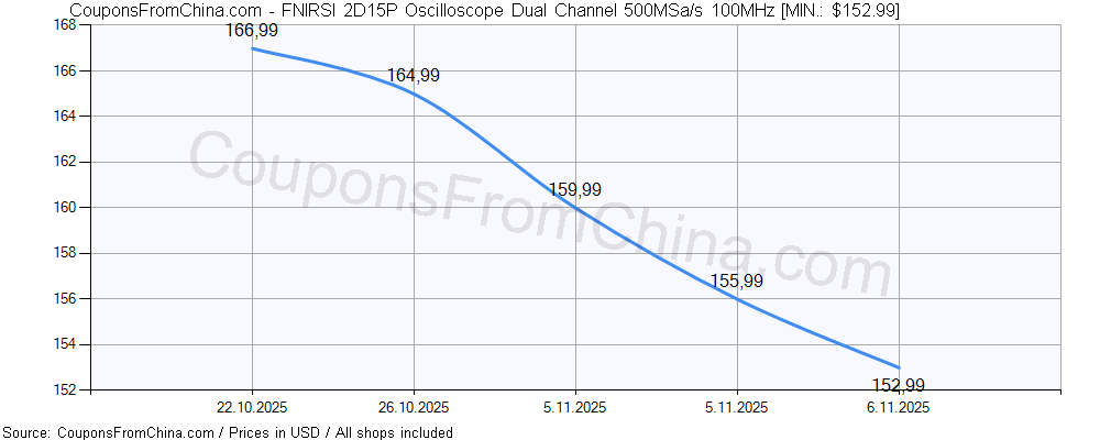 Here is price history (for all/most countries) for FNIRSI 2D15P Oscilloscope Dual Channel 500MSa/s 100MHz. The lowest price was: $152.99.