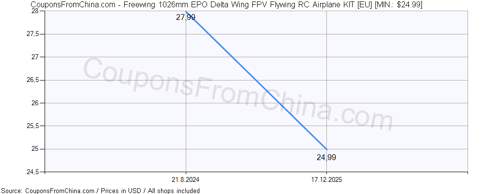 Here is price history (for all/most countries) for Freewing 1026mm EPO Delta Wing FPV Flywing RC Airplane KIT [EU]. The lowest price was: $24.99.