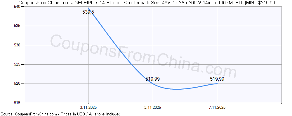 Price history (for all/most countries) for GELEIPU C14 Electric Scooter with Seat 48V 17.5Ah 500W 14inch 100KM [EU] is here. The lowest price was: $519.99.
