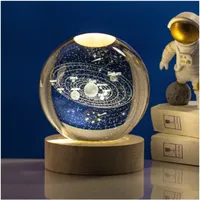 Creative crystal ball Planet Globe 3D Laser Engraved Solar System Ball Solid Wood Base Luminous Crystal Led Light Small Ornament $3.96