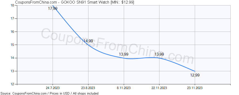 Here is price history (for all/most countries) for GOKOO SN91 Smart Watch. The lowest price was: $12.99.
