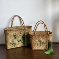 Retro Traditional Handmade Seagrass Embroidery Weaving Basket, New Chinese Style Handbag Tea Set Storage Handheld