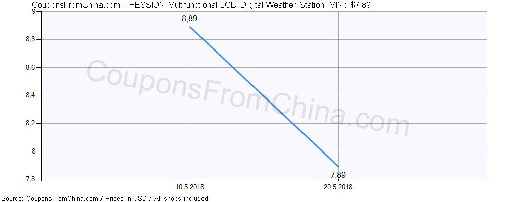 Do you need price history chart (for all/most countries) for HESSION Multifunctional LCD Digital Weather Station? There we go. The lowest price was: $7.89.