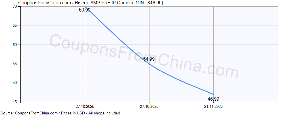 Here is price history (for all/most countries) for Hiseeu 8MP PoE IP Camera. The lowest price was: $46.99.