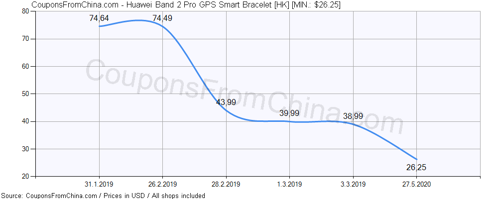 Here is price history (for all/most countries) for Huawei Band 2 Pro GPS Smart Bracelet [HK]. The lowest price was: $26.25.