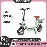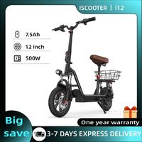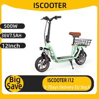 The iScooter i12 is a 12-inch 500W 36V 7.5Ah electric bicycle with a seat, a top speed of 40 km/h, and a range of 35 km. $388.54