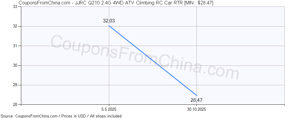Here is price history (for all/most countries) for JJRC Q210 2.4G 4WD ATV Climbing RC Car RTR. The lowest price was: $28.47.